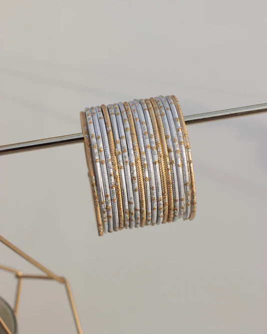 Elevate your style with this elegant White Sparkle Bangle Set, featuring a glossy white base beautifully dusted with golden shimmer. Perfect for festive wear or casual elegance, these lightweight bangles add a touch of sophistication to every outfit. A must-have for those who love subtle glamour and timeless charm.