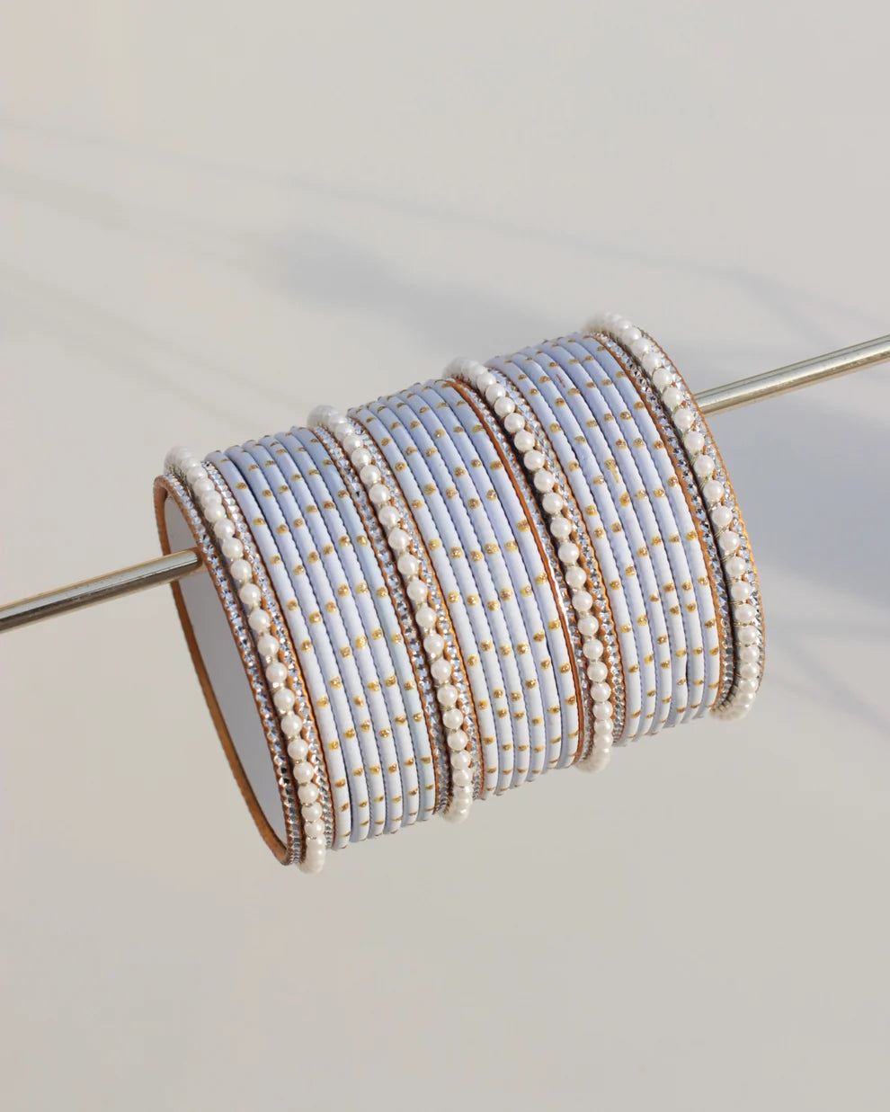 Elevate your style with this elegant White Sparkle Bangle Set, featuring a glossy white base beautifully dusted with golden shimmer. Perfect for festive wear or casual elegance, these lightweight bangles add a touch of sophistication to every outfit. A must-have for those who love subtle glamour and timeless charm.